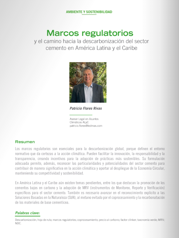Estudio de Precio al Carbono, Economía Circular y Coprocesamiento para el Instituto del Cemento y el Hormigón de Chile (ICH); para la Asociación de Productores de Cemento del Perú (ASOCEM); para el Instituto Ecuatoriano del Cemento y el Hormigón (INECYC) y para Asociación Dominicana de Productores de Cemento Portland (ADOCEM). Estudios de Precio al Carbono y Marcos Regulatorios para el Cemento en América Latina y el Caribe, como asesoría en contratos y acuerdos en materia de descarbonización del sector cemento para la Federación Interamericana del Cemento (FICEM).